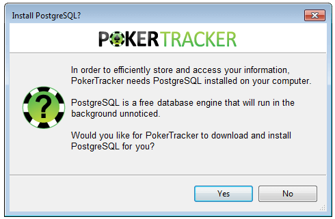 Как же инсталлировать базу данных PostgreSQL? Здесь тоже все просто. Для начала запустите установленный Покер Трекер 4. После этого сразу же появится окно с сообщением, где будет предложено скачать и инсталлировать PostgreSQL. Нажмите на кнопку Yes. Теперь остается дождаться завершения процесса скачивания и установки базы данных, о чем оповестит соответствующее сообщение.