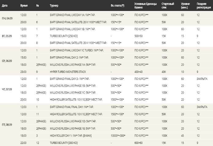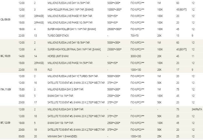 Турниры для хайройллеров будут проходить ежедневно, за исключением последнего дня, где соберутся игроки более низких лимитов. Сегодня еще не закрыта регистрация на некоторые из турнирных событий. А значит, каждый желающий, внеся соответствующий бай-ин, сможет принять участие в Millions Russia и побороться за часть от многомиллионного призового фонда. Представляем вашему вниманию расписание турниров: