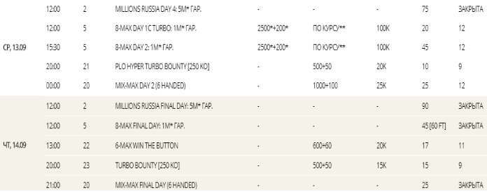 В рамках фестиваля Millions Russia пройдет свыше 20 турниров. Бай-ины к ним начинаются от 15 000 долларов. Но некоторые игроки смогли отобраться на них посредством сателлитов, которые проходили в покерной комнате PartyPoker.
